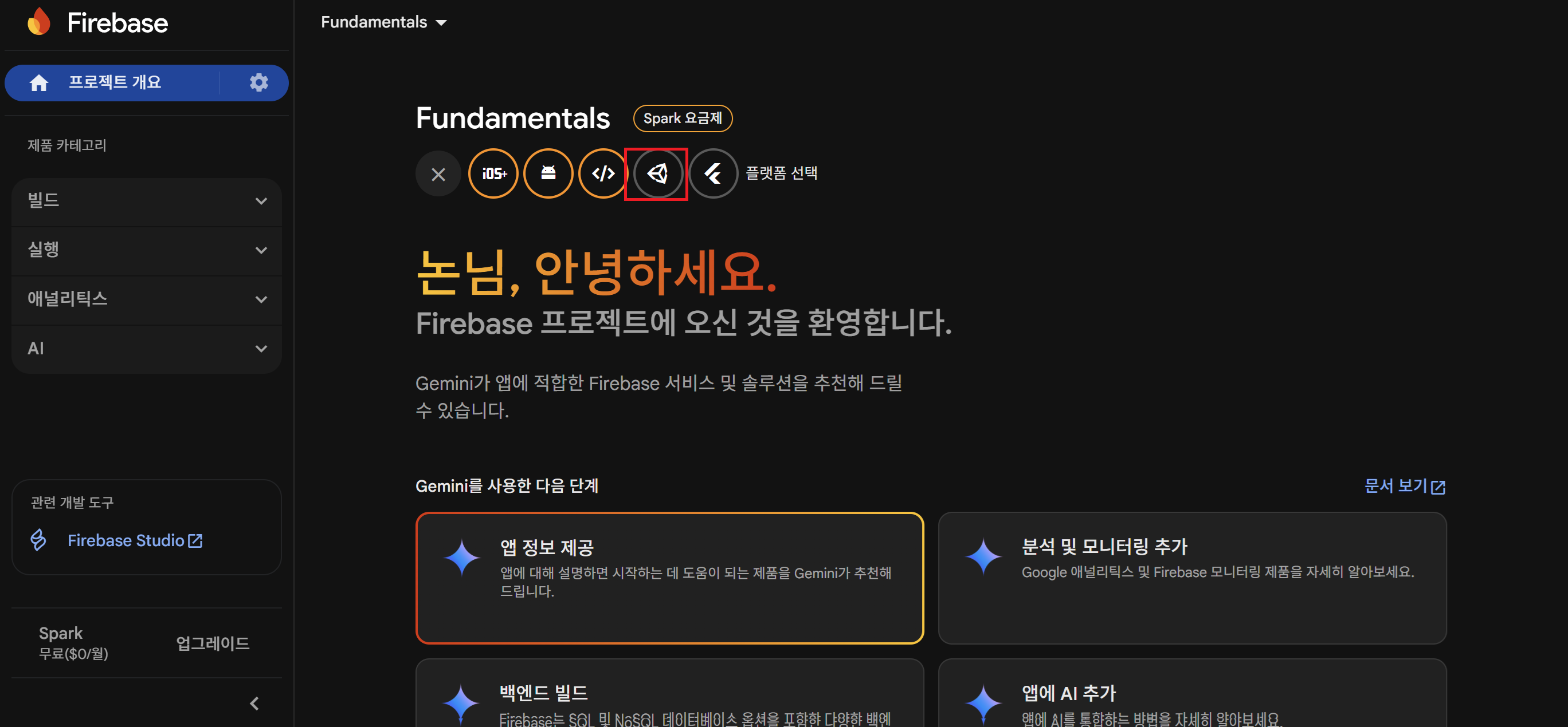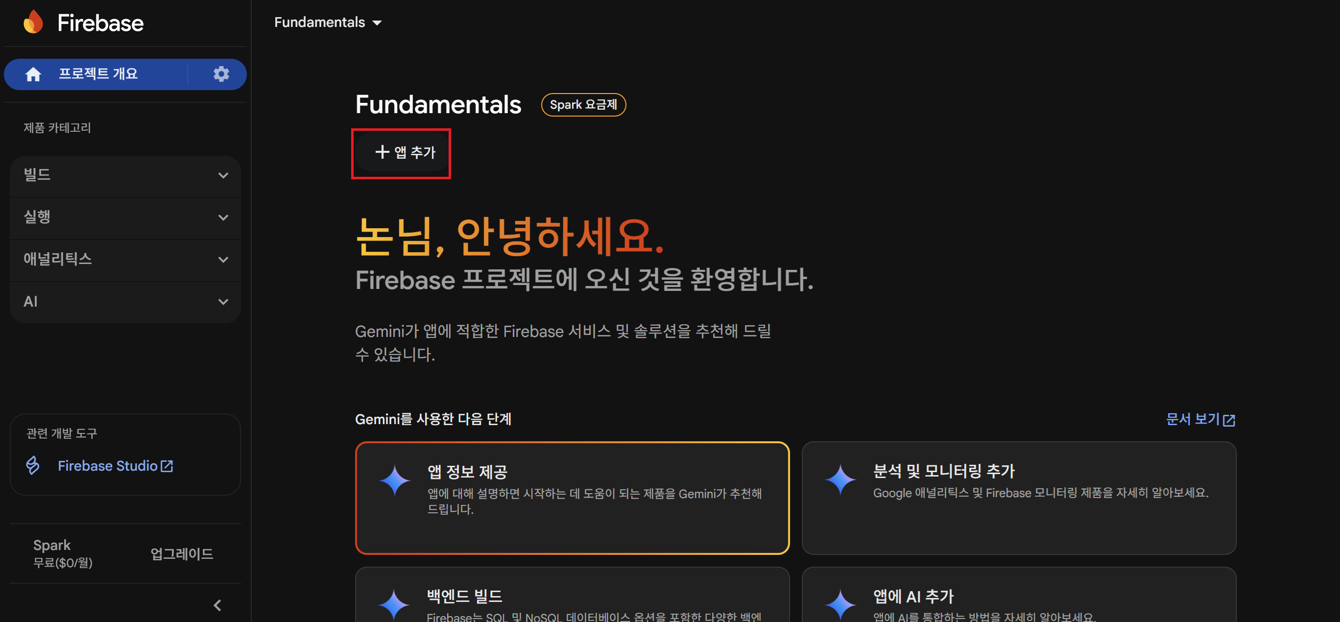 왼쪽 상단 프로젝트 개요 선택 후 => 앱추가